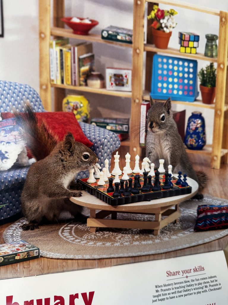 As February unfolded, the Alice in Wonderland references in my life continued to emerge. I began to work my way through the second story Through the Looking Glass, a sequel noted for charming chess-board pieces and an irreverent play at logic and convention. One striking moment of synchronicity was when I realized that even the squirrel calendar by my workstation at home was aligned to the theme. This particular calendar was a favorite of my dad’s, always hanging by his computer, and there it was, February 2026’s theme: two squirrels locked in a match of chess. “Curiouser and curiouser,” as Alice would say. There were other coincidences, too, though they slipped through my grasp and out of my mind at the time.